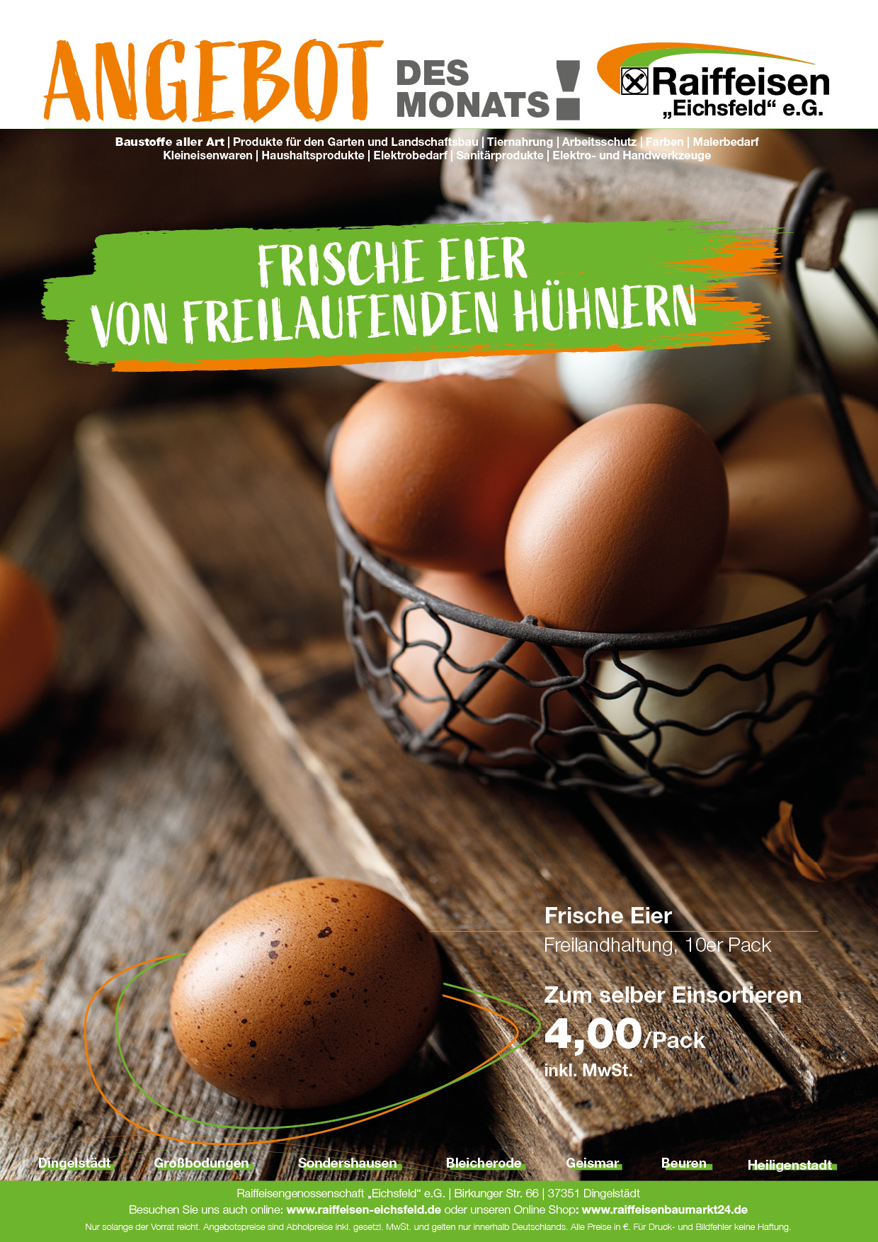 Unser Sortiment umfasst Baustoffe, Produkte für den Garten und Landschaftsbau,Tiernahrung, Arbeitsschutz, Farben, Malerbedarf, Kleineisenwaren, Haushaltsprodukte, Elektrobedarf, Sanitärprodukte, Elektro- sowie Handwerkzeuge.